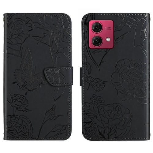• 1x Funda de Cuero para Motorola Moto G84 HT03 Skin Feel Butterfly con Tapa en Relieve (Negro)