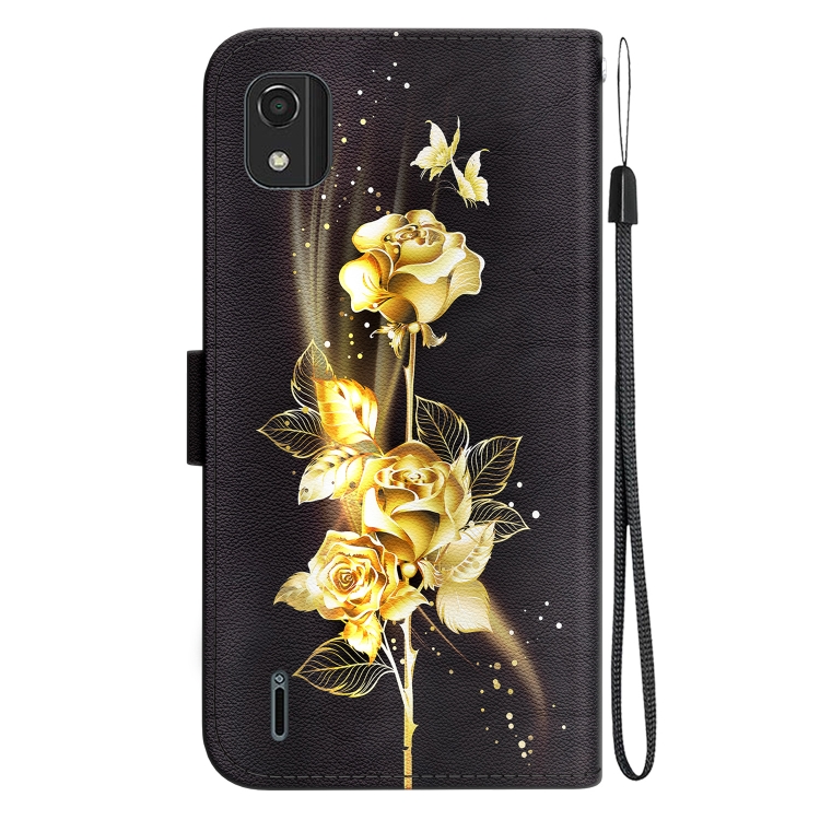 Estuche de Cuero para Nokia C2 2Da Edición con Dibujo Coloreado y Textura de Cristal (Mariposa Dorada Rosa)
