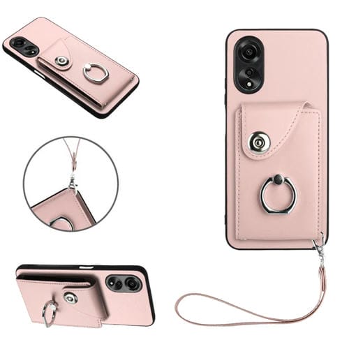 Para Oppo A17 Global Organ Card Bag Ring Holder Funda para Teléfono de Pu con Cordón (Rosa)