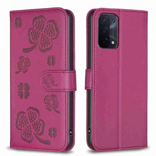 Para Oppo A74 5G / A93 5G / A54 5G Funda para Teléfono de Cuero En Relieve de Cuatro Hojas (Rojo Rosa)