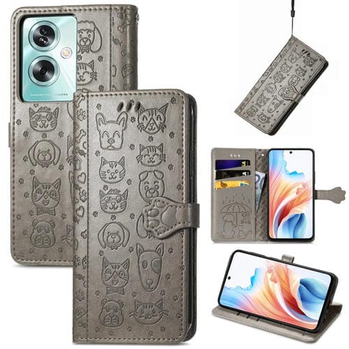 Para Oppo A79 5G / A2 5G Funda para Teléfono de Cuero con Relieve de Perro y Gato (Gris)