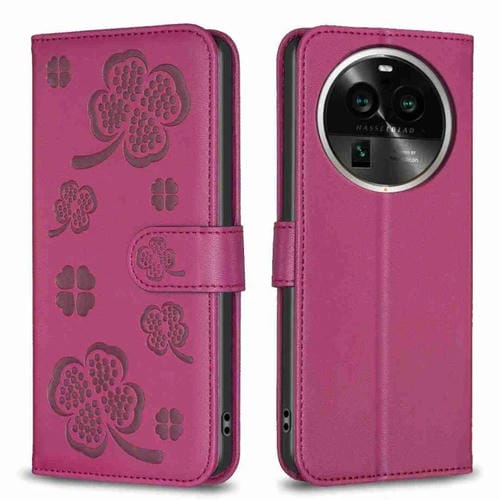 Para Oppo Find X6 Pro Funda de Cuero con Relieve de Cuatro Hojas para Teléfono (Rojo Rosa)