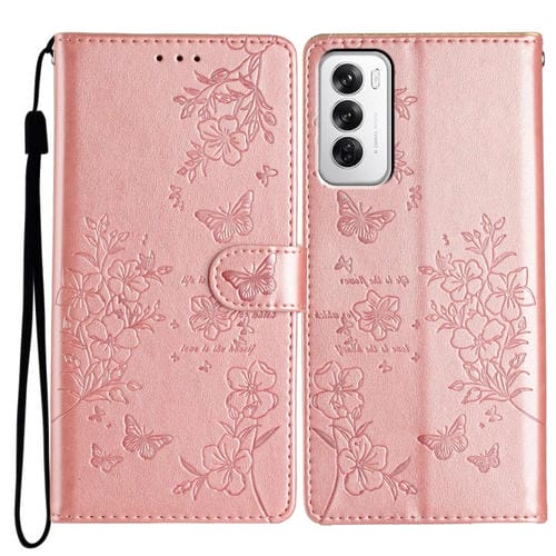 Para Oppo Reno12 5G Global Butterfly Love Flower Funda de Cuero para Teléfono En Relieve (Oro Rosa)