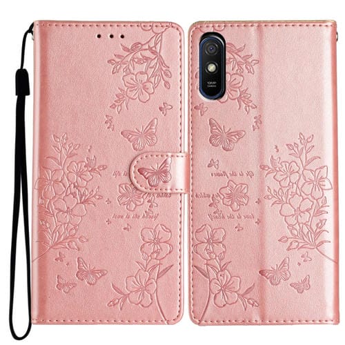 Para Redmi 9A Funda de Cuero para Teléfono con Mariposas y Flores (Oro Rosa)