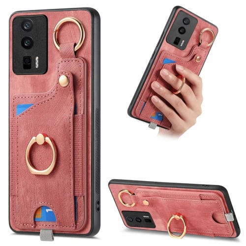 Para Redmi K60 / 60 Pro Funda para Teléfono con Bolsa para Tarjeta con Anillo y Sensación de Piel Retro con Lazo para Colgar (Rosa)