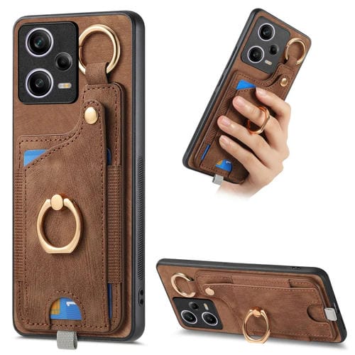 Para Redmi Note 12 Pro 5G Funda para Teléfono con Bolsa para Tarjeta con Anillo y Sensación de Piel Retro con Lazo para Colgar (Marrón)