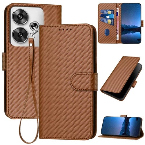 Para Redmi Turbo 3 / Xiaomi Poco F6 Yx0070 Funda de Cuero con Hebilla de Fibra de Carbono y Cordón (Café)