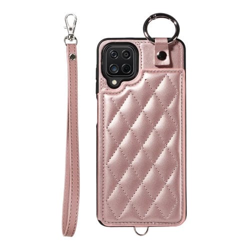 Estuche para Teléfono Samsung Galaxy A12 4G con Bolsa para Tarjetas Textura Rómbica y Cordón Corto (Oro Rosa)