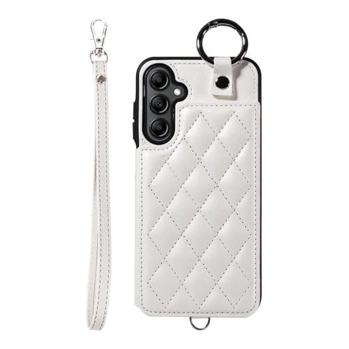 Estuche para Teléfono Samsung Galaxy A14 4G 5G con Bolsa para Tarjetas Textura Rómbica y Cordón Corto (Blanco)