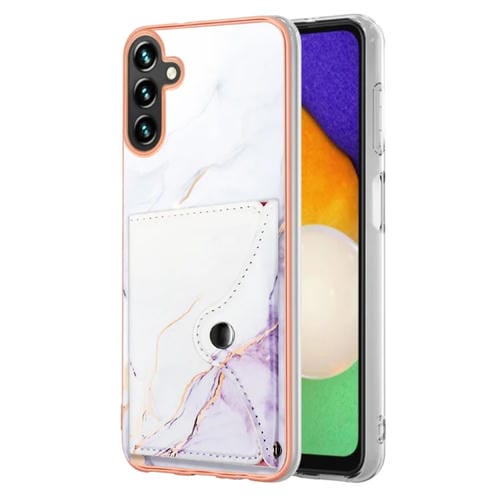 Estuche para Teléfono Samsung Galaxy A14 5G con Ranura para Tarjeta Imd y Patrón de Mármol (Blanco y Morado)