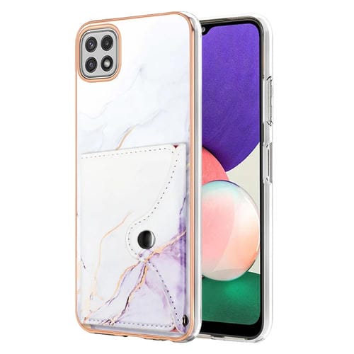Estuche para teléfono Samsung Galaxy A22 5G Versión EE.UU con ranura para tarjeta Imd patrón mármol (Blanco y Morado)