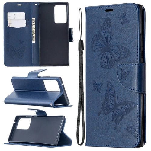 Estuche para Samsung Galaxy Note20 Ultra Cuero PU Estampado Mariposas Soporte Ranura Tarjeta Billetera Cordón (Azul)