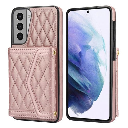 Estuche para Teléfono Samsung Galaxy S21 + 5G con Bolsa para Tarjetas Textura Rómbica Empalme Cordón Largo (Oro Rosa)
