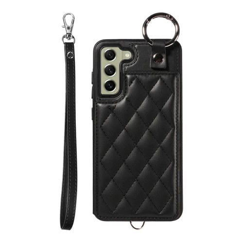 Estuche para teléfono Samsung Galaxy S21 FE 5G con bolsa para tarjetas textura rómbica y cordón corto (Negro)