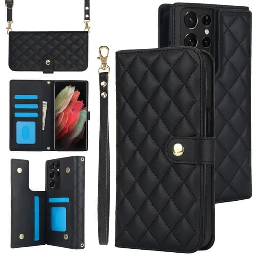 Estuche para Teléfono Samsung Galaxy S21 Ultra 5G Crossbody Cuero Rómbico Multifunción (Negro)