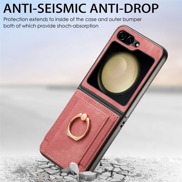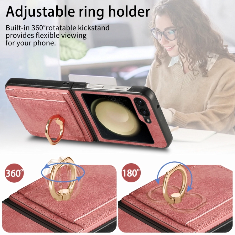 Funda para teléfono Samsung Galaxy Z Flip 5 con bolsa para tarjeta anillo y sensación de piel retro (Rosa)