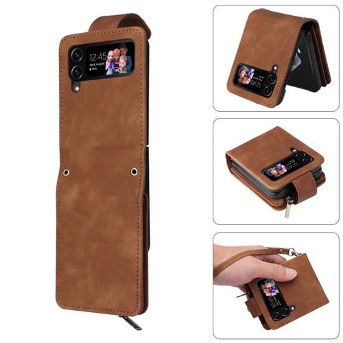 Estuche para teléfono Samsung Galaxy Z Flip4 cuero billetera cremallera esmerilada multifuncional (Marrón)