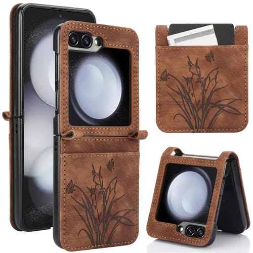 Funda para Teléfono Samsung Galaxy Z Flip5 Cuero Relieve Mariposa Orquídea (Marrón)