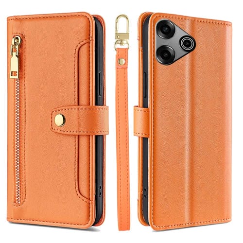 Funda de Cuero para Tecno Pova 6 Pro 5G con Billetera, Cremallera y Textura de Oveja (Naranja)