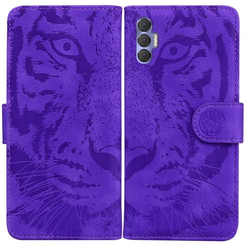 Funda Flip Leather Case para Tecno Spark 8 Pro con Estampado Horizontal Tiger (Púrpura)