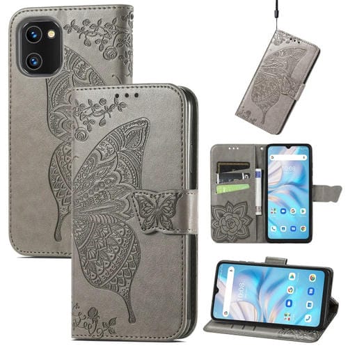 Estuche para Umidigi A13S Butterfly Love Flower de Cuero en Relieve (Gris)