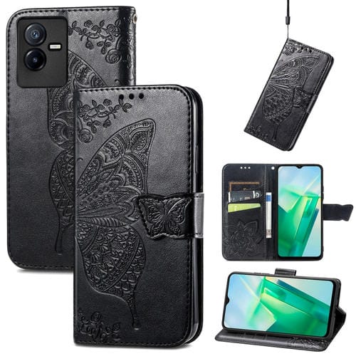 Para Vivo T2X 5G Butterfly Love Flower Caja de Teléfono de Cuero En Relieve (Negro)