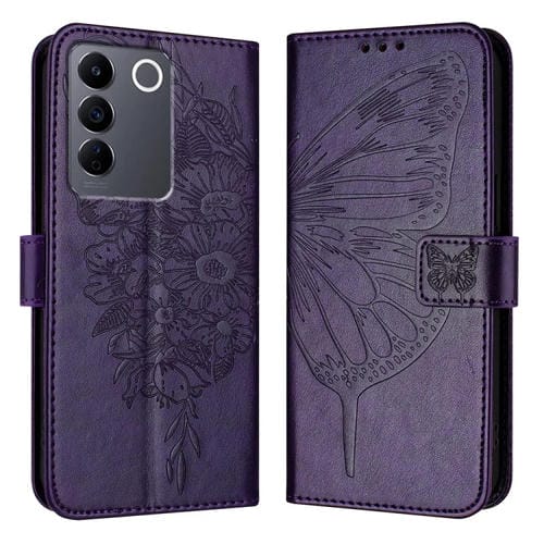 Para Vivo V27E 4G Global / T2 4G Global Funda de Cuero con Mariposa En Relieve (Púrpura Oscuro)