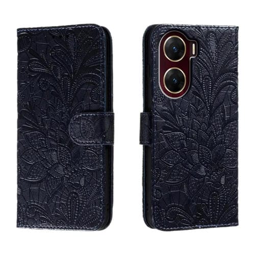 Para Vivo V29E Funda para Teléfono de Cuero con Tapa y Estampado de Flores de Encaje (Azul Oscuro)