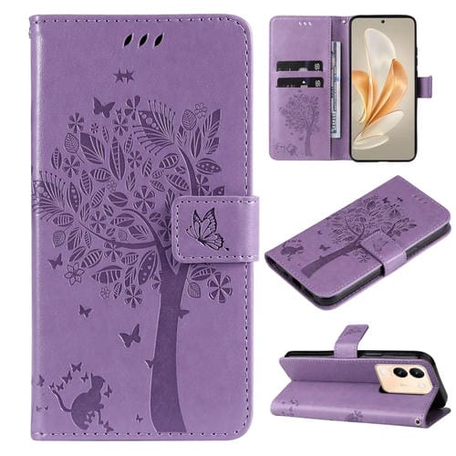 Para Vivo V29E Global / Y200 5G Global Funda para Teléfono de Cuero con Tapa con Patrón En Relieve de Árbol y Gato (Púrpura Claro)