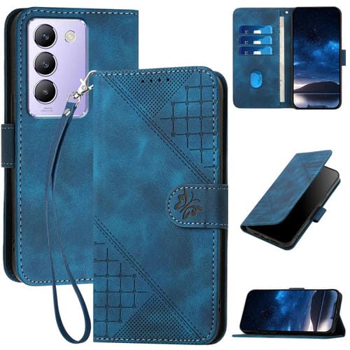 Para Vivo Y200E 5G Global Yx0080 Grid Butterfly Patrón En Relieve Funda de Cuero con Tapa para Teléfono con Cordón (Azul Oscuro)