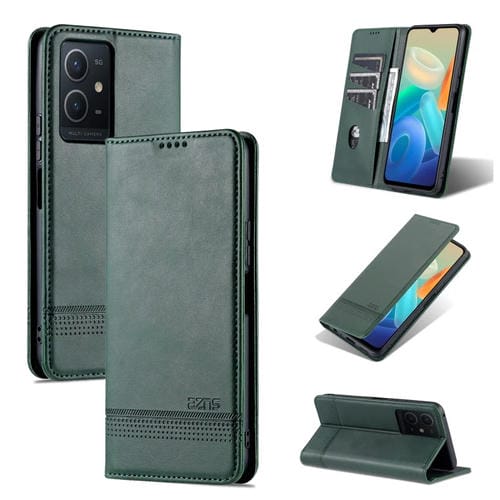 Para Vivo Y33S 5G / Y75 5G Azns Texture Magnético Texture Telea de Cuero de Cuero (Verde Oscuro)