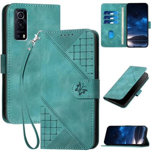 Para Vivo Y72 5G / Iqoo Z3 Yx0080 Funda para Teléfono de Cuero con Tapa y Patrón En Relieve de Mariposa En Cuadrícula con Cordón (Azul Claro)