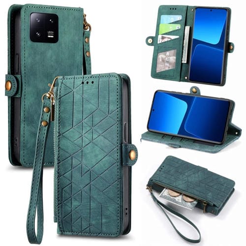Para Xiaomi 13 Pro Estuche para Teléfono de Cuero con Cremallera Geométrica y Hebilla Lateral (Verde)