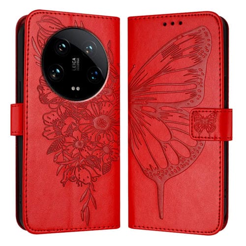Para Xiaomi 14 Ultra 5G Funda De Teléfono De Cuero Con Mariposa En Relieve Global (Rojo)