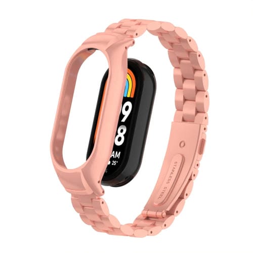 Caja de Metal integrada para Xiaomi Mi Band 8 + Correa de Reloj de Tres Cuentas (Rosa Brillante)