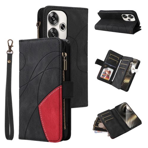 Para Xiaomi Poco F6 Funda de Cuero para Teléfono con Billetera con Cremallera y 9 Ranuras para Tarjetas de Doble Color (Negro)