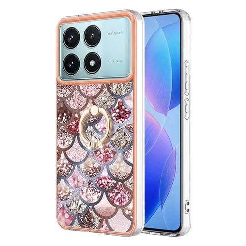Para Xiaomi Poco F6 Pro 5G Estuche a Prueba de Golpes con Patrón de Galvanoplastia Imd TPU con Soporte de Anillo de Diamantes de Imitación (Escamas Rosas)