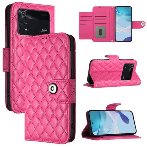 Para Xiaomi Poco M4 Pro 4G Funda para Teléfono con Tapa de Cuero con Textura Romboidal y Cordón (Rojo Rosa)