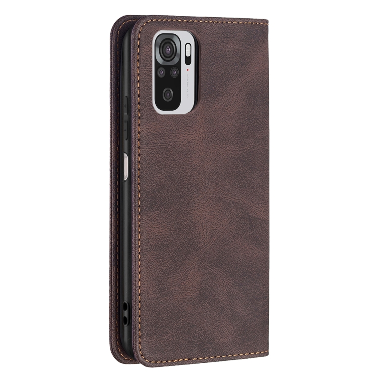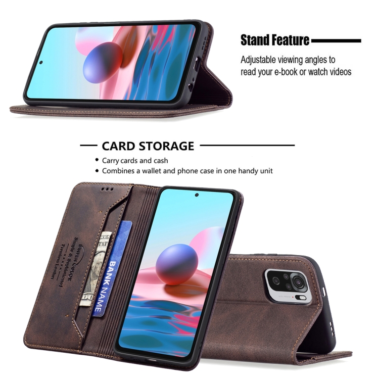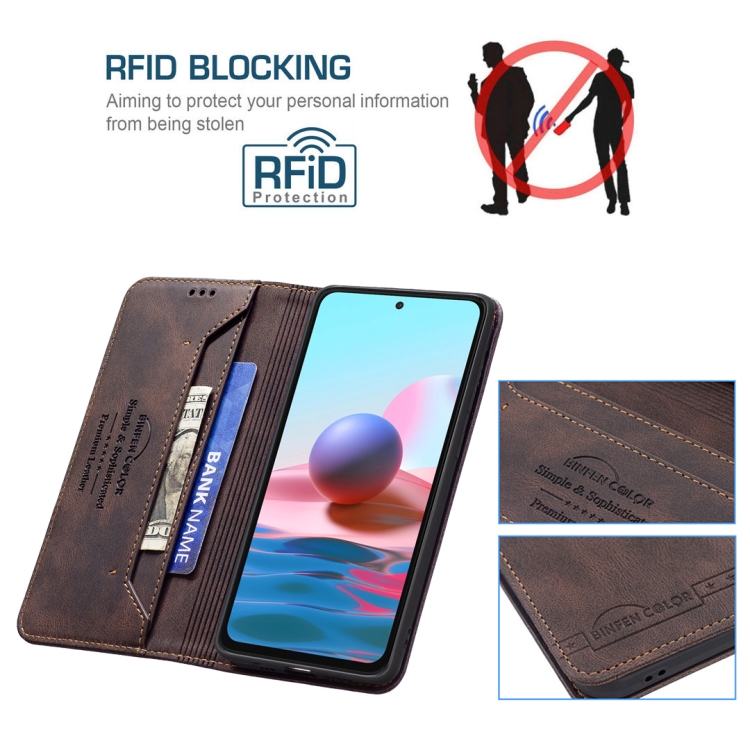 Para Xiaomi Redmi Note 10 4G / Nota 10S Funda de cuero antirrobo de bloqueo de RFID magnético con soporte y tragamonedas y billetera (marrón)