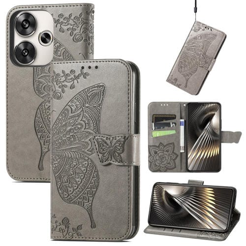 Para Xiaomi Redmi Turbo 3 5G Butterfly Love Flower Funda de Cuero para Teléfono En Relieve (Gris)