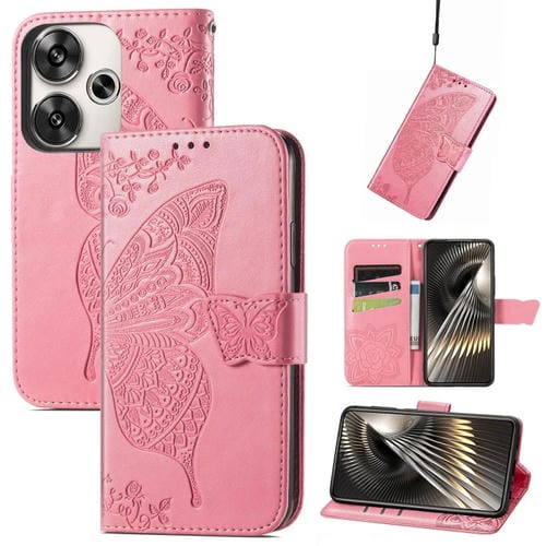 Para Xiaomi Redmi Turbo 3 5G Funda para Teléfono de Cuero con Relieve de Flor de Amor y Mariposa (Rosa)