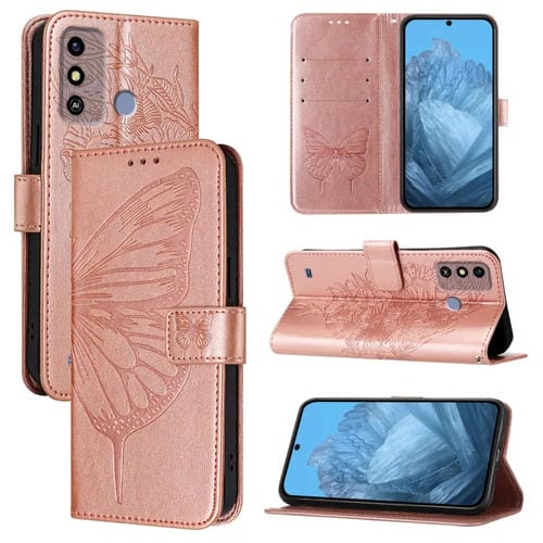 Funda de Cuero ZTE Blade A53 con Mariposa en Relieve (Oro Rosa)