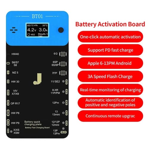 - Entrada de interfaz tipo C compatible con Carga rápida PD; Pantalla OLED HD de 0,8 pulgadas; indicador de zumbador incorporado; activación automática de una Tecla; identificación automática de polaridad; monitoreo en tiempo real del voltaje y salud de la Batería; Soporte para actualización remota vía plataforma JCID; simulación de esquema de Carga para Carga rápida segura