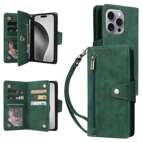 Funda de Cuero para iPhone 16 Pro Max con Tres Pliegues y Hebilla de Remache (Verde)