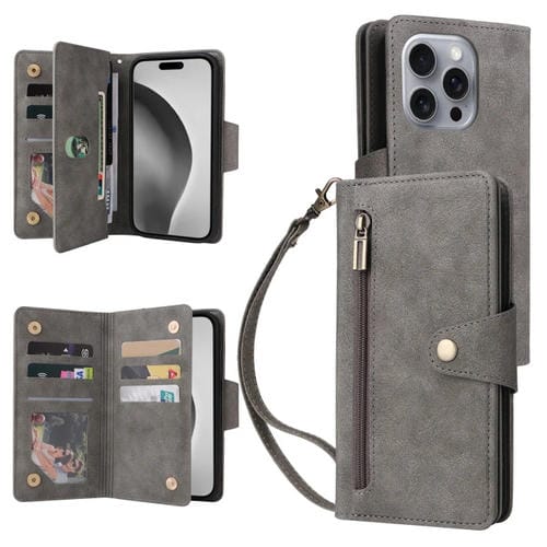 Funda de Cuero con Tres Pliegues y Hebilla de Remache para iPhone 16 Pro Max (Gris)