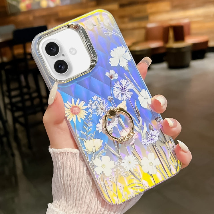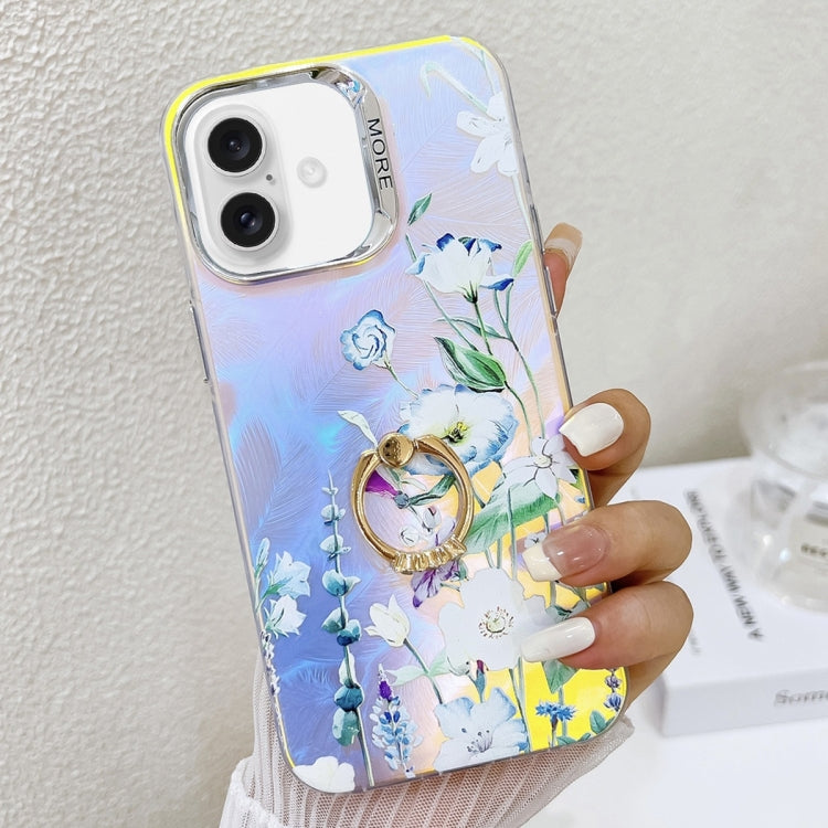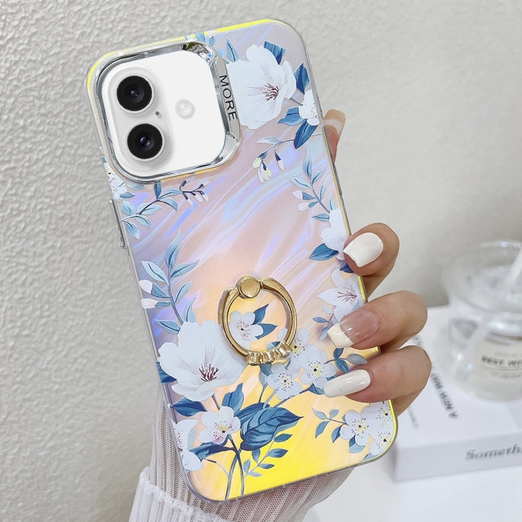 Caja de teléfono TPU para iPhone 16 Plus con soporte de anillo y flor láser de galvanoplastia (Azul)