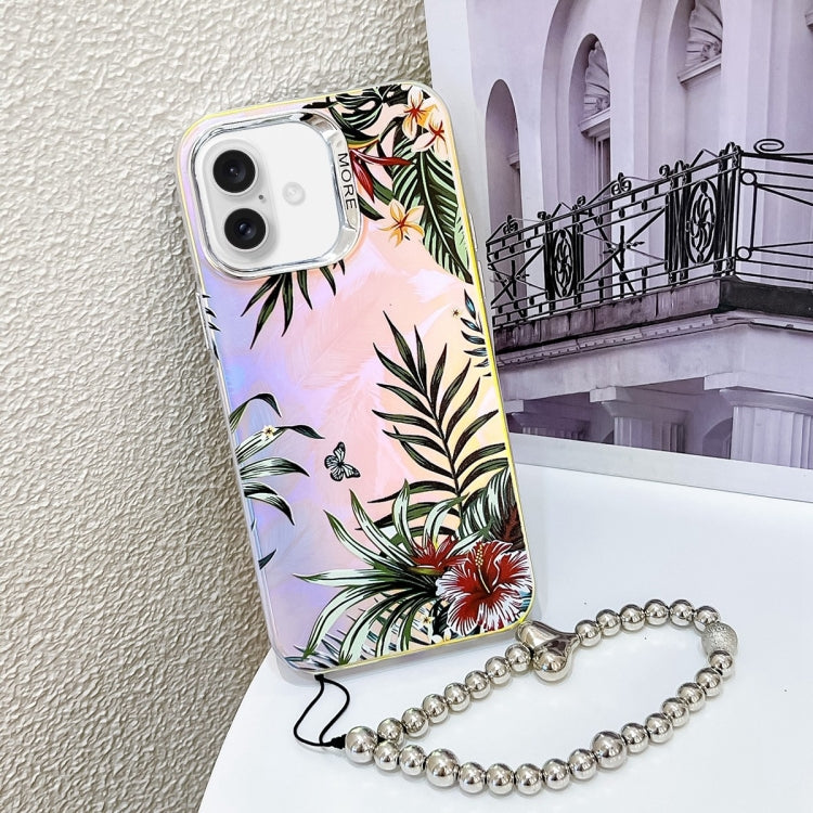 Estuche para teléfono iPhone 16 Plus con flor láser galvanizada y correa para la muñeca (Hojas Ah12)