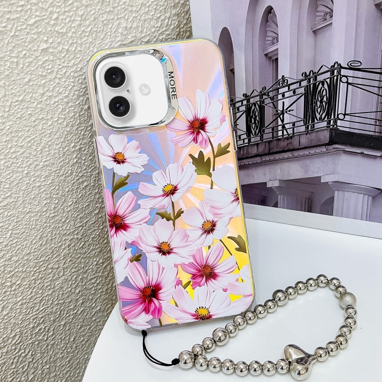 Funda para Teléfono iPhone 16 Cosmos Flower Ah7 con Flor Láser Galvanizada y Correa para la Muñeca