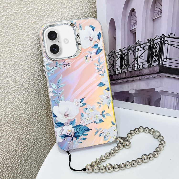 Funda para Teléfono iPhone 16 Plus Flor Láser Galvanizada con Correa para Muñeca (Flor Blanca)