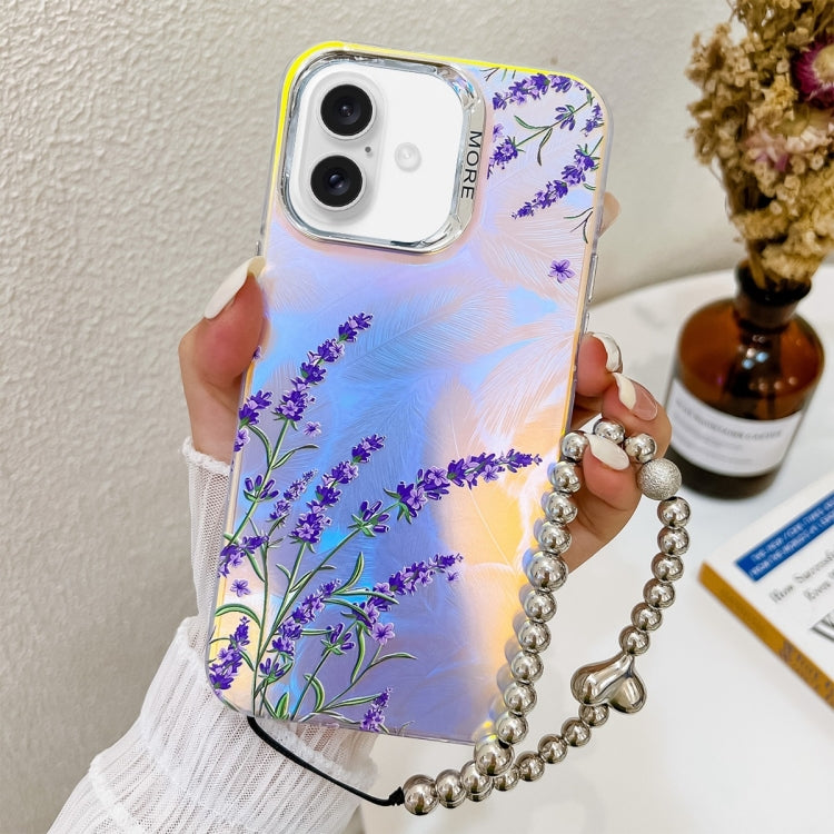 Funda para Teléfono iPhone 16 Flor Láser Galvanizada con Correa para la Muñeca (Lavender)